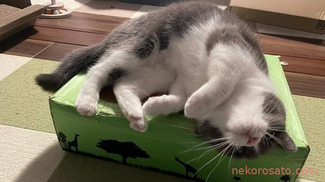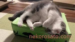 ステップ台の上でごろにゃんごろにゃん、撫でてと見つめてくるさとちゃん。
