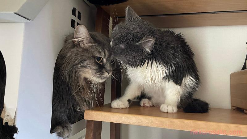 お互いグルーミングしあって、ひどいこと(シャンプー)された心の傷をなめ合ってるのでしょうか。