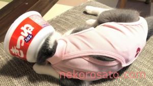 どんぶりから顔ははみ出してますが、傷口を舐めることはできないので、エリザベスカラーの役割は果たしてくれています。